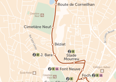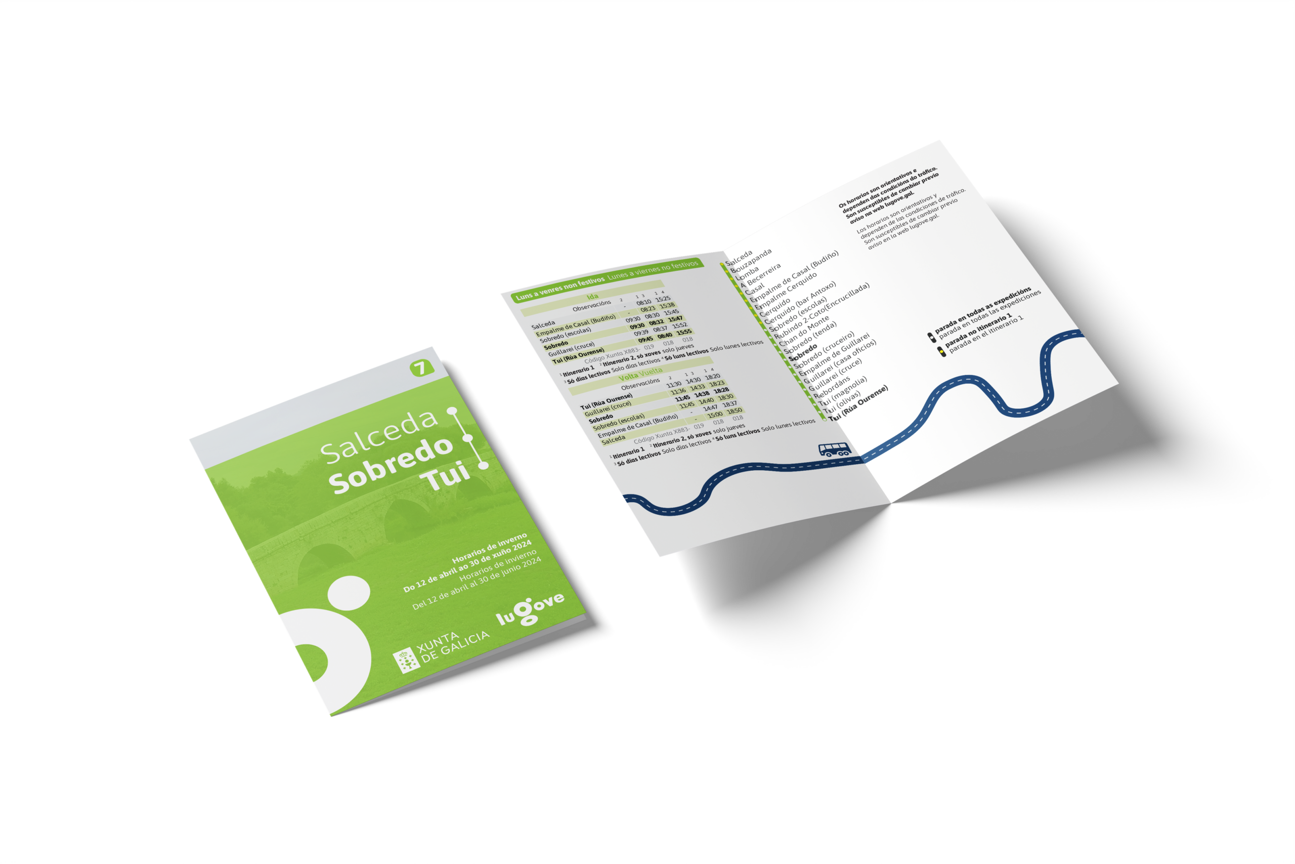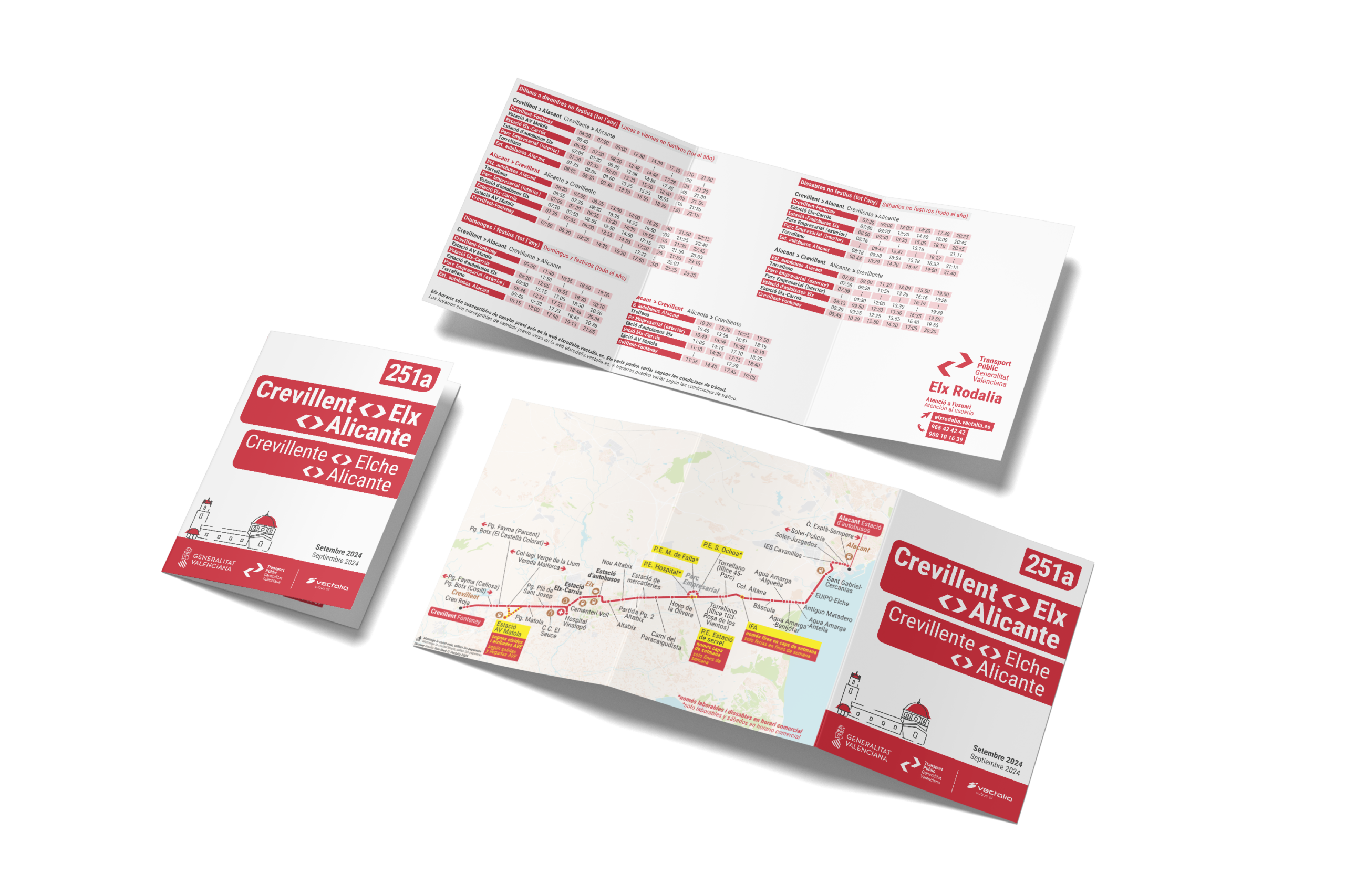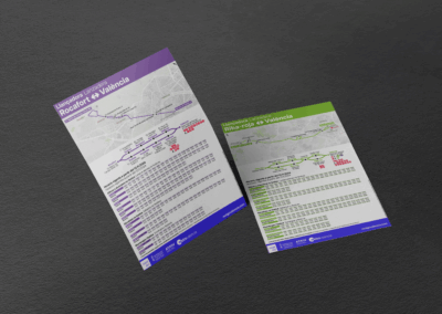 Folletos de transporte público: planos de líneas, mapas de red completos, horarios simplificados o información combinada para eventos y campañas.